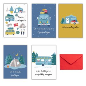 Setje 5 kerstkaarten kamperen – serie ‘Gezellig’