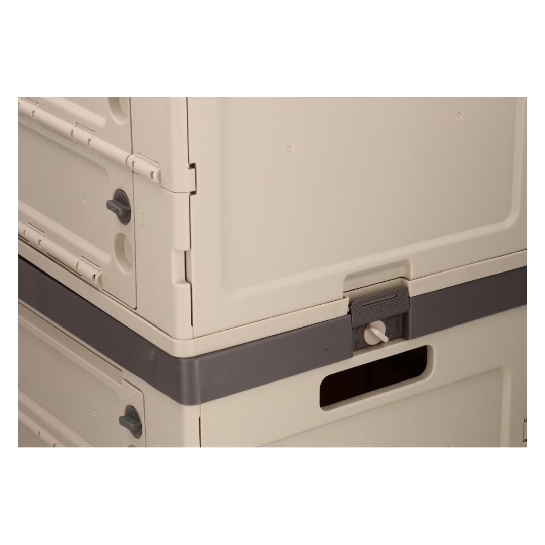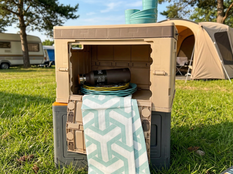 De Campbox Nomad is opvouwbaar en daardoor compact mee te nemen. Eenmaal uitgeklapt zet je hem eenvoudig in elkaar. Hij is lichtgewicht, maar zodra je de zijkanten vastzet ontstaat er een stevige box die je ook goed kunt stapelen. Het deksel is voorzien van handige haken, zodat het netjes op zijn plek blijft en niet los rond slingert.