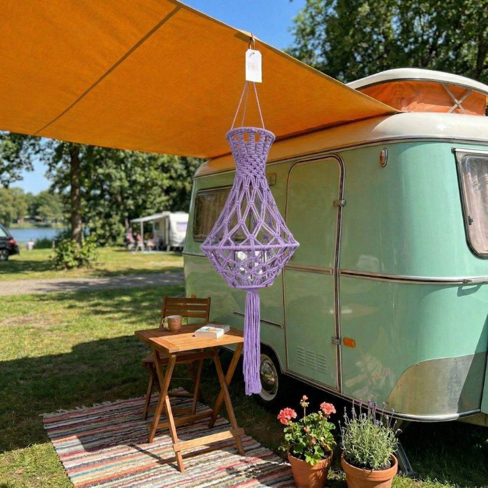 Breng extra sfeer naar je kampeerplek met deze vrolijke gehaakte hanger. Perfect voor onder de luifel, in de voortent, tent of gewoon in de tuin. De warme lila kleur geeft meteen een gezellige en persoonlijke uitstraling, wij houden heel erg van kleur op de camping! De hanger is voorzien van een ring aan de bovenzijde, zodat je hem eenvoudig ophangt aan een tentstok, luifel of haak. Met een lengte van ca. 85 cm en een breedte van ca. 25 cm valt hij mooi op zonder te overheersen.