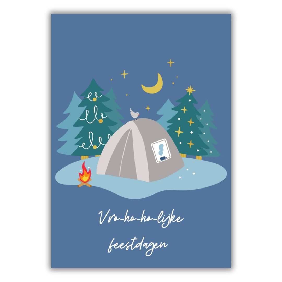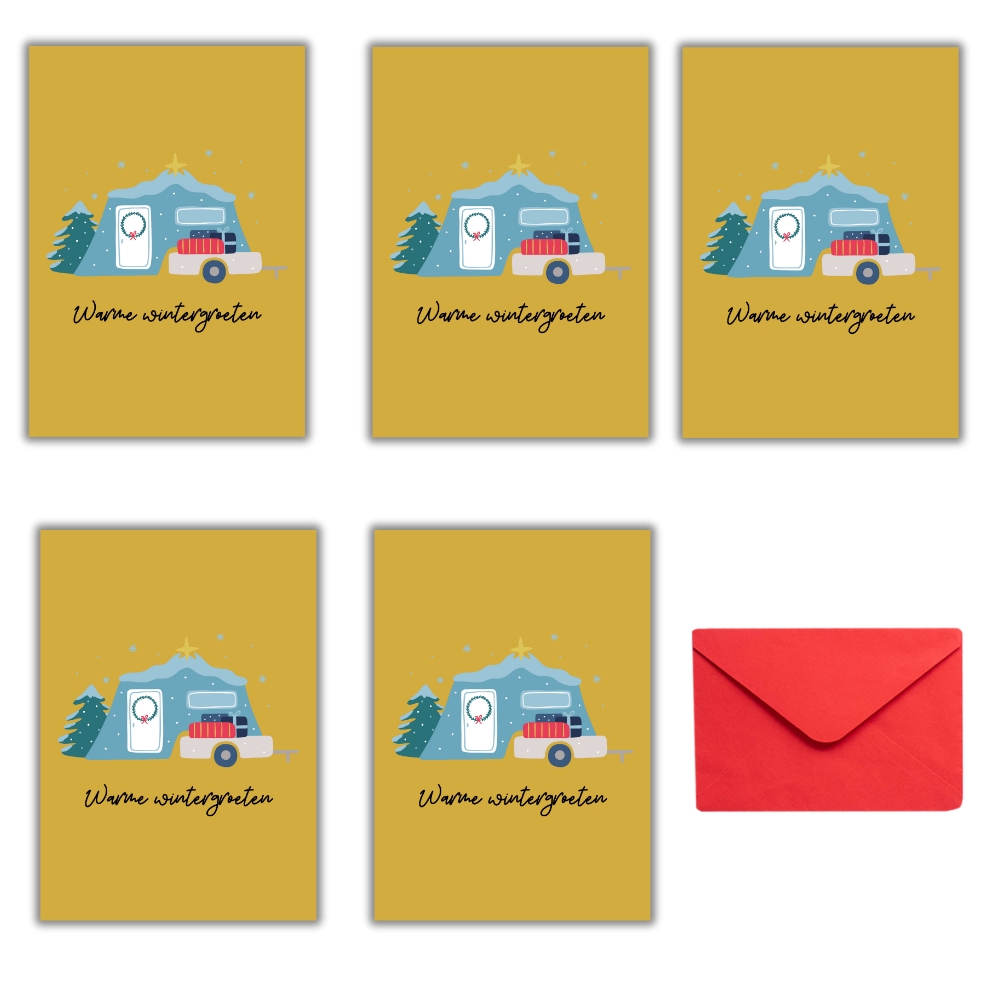 Setje 5 dubbele kerstkaarten kamperen - serie 'Wintergroeten'