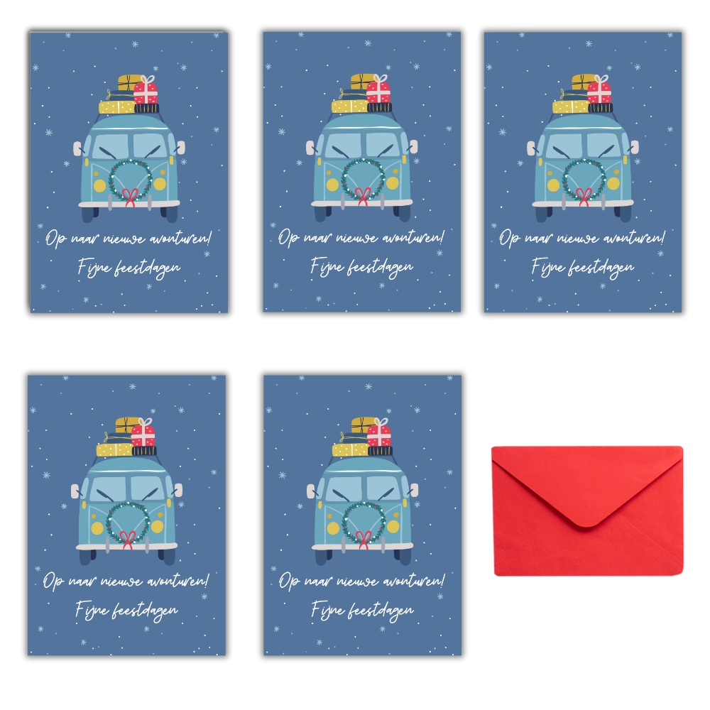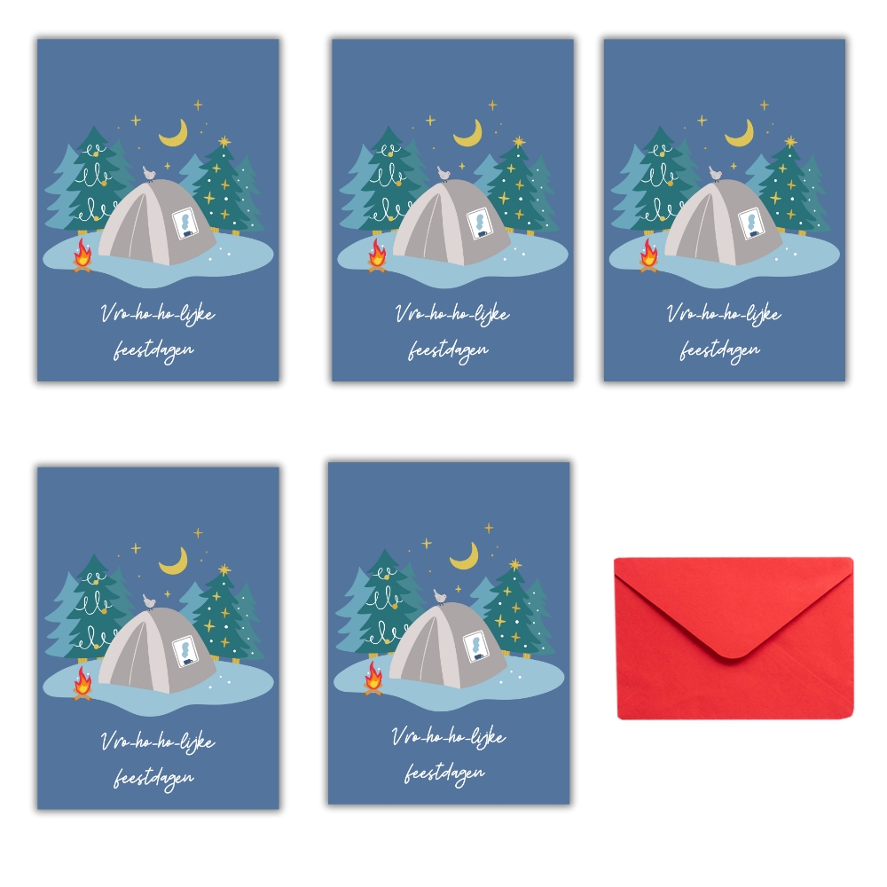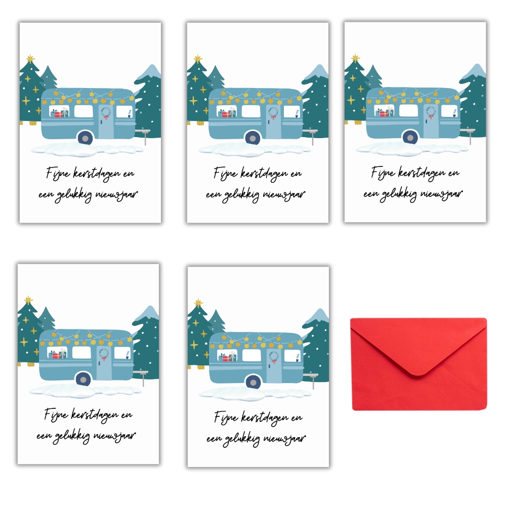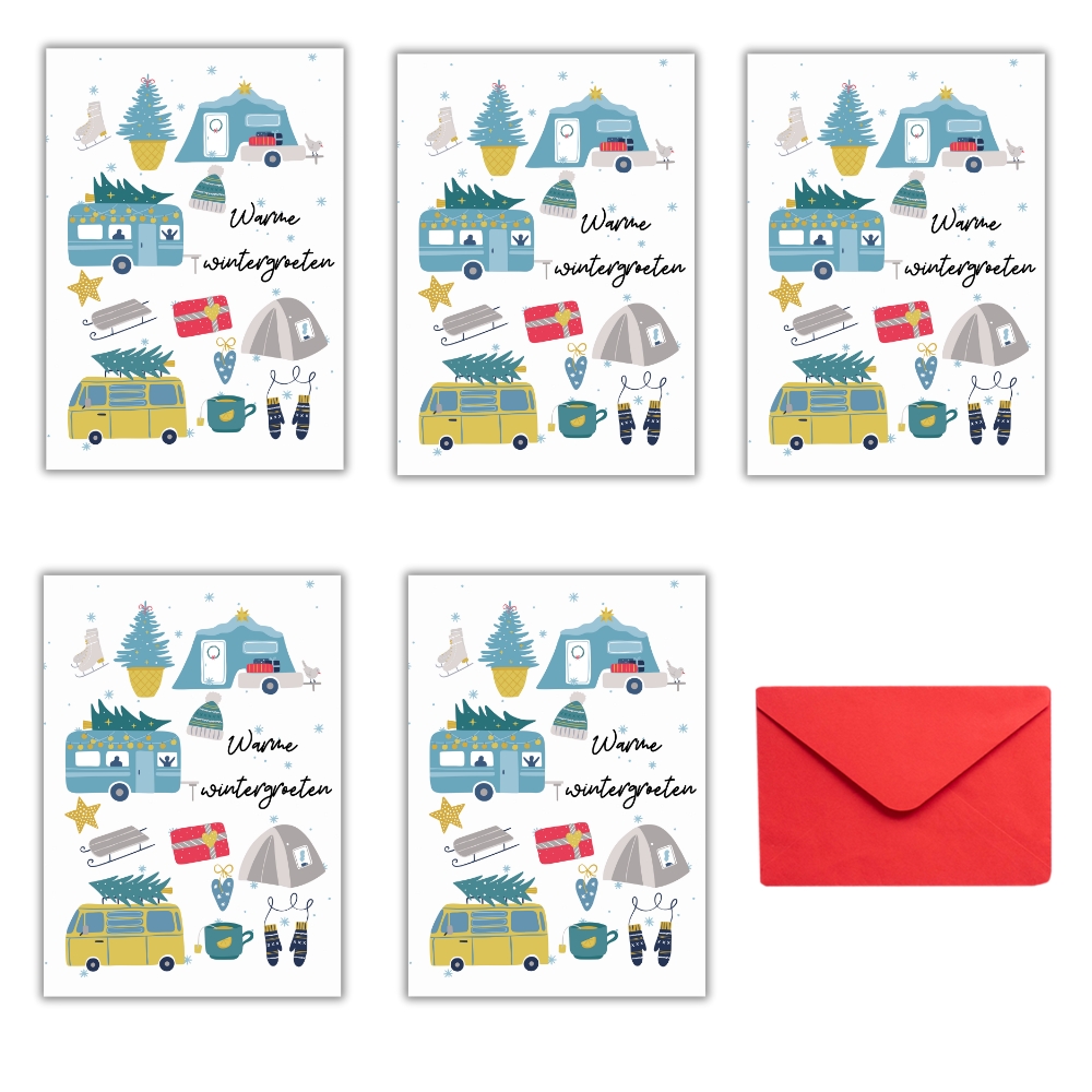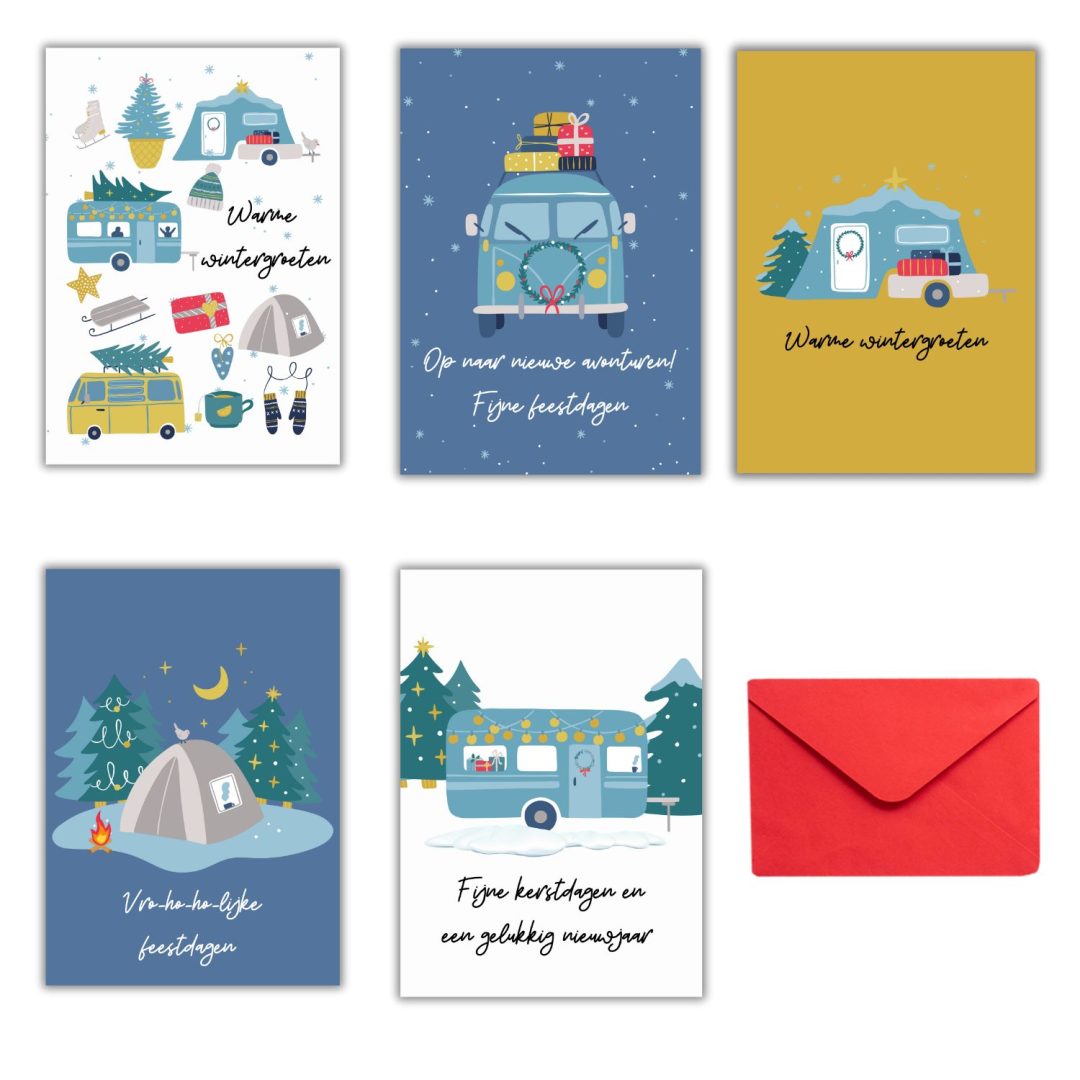 Kerstkaarten voor echte kampeerders! Een setje van 5 leuke winterse kaarten met verschillende kampeermiddelen: de tent, caravan, camper, vouwwagen én een sfeervolle winterkaart met alle 4 kampeermiddelen. Je kiest zelf of je 5 verschillende kaarten wil ontvangen, of liever 5 van dezelfde soort. Dit jaar kozen we voor dubbele kaarten, met een blanco binnenzijde voor een warme groet aan je leukste kampeervrienden en familie. De ansichtkaarten zijn A6 formaat (10,5 x 14,8 cm) en komen elk met een rode envelop.