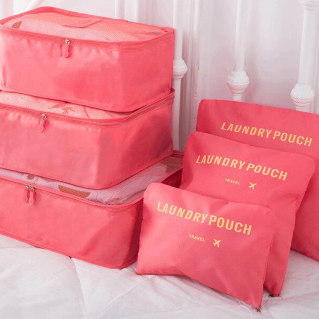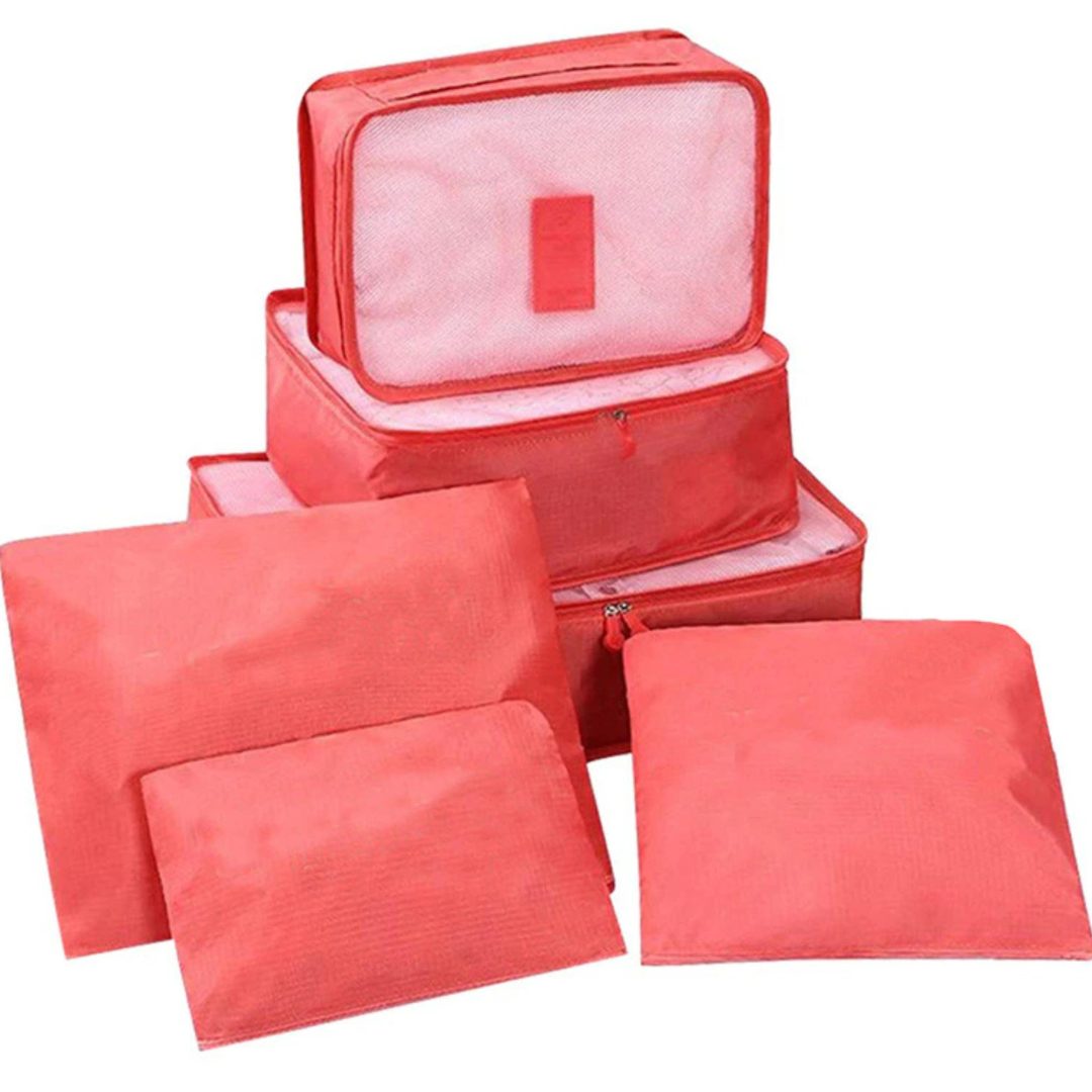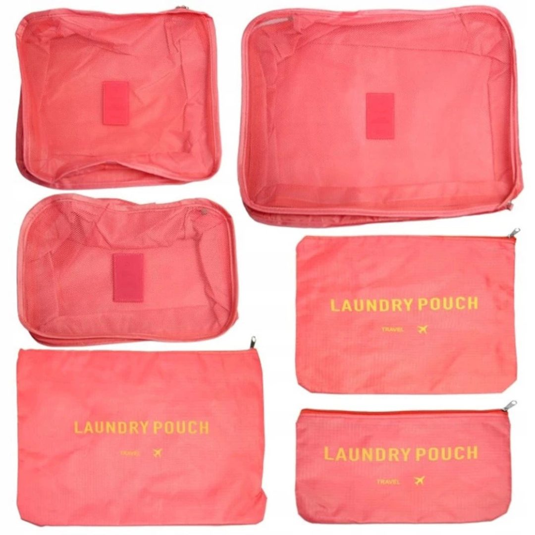 6 delige set met 3 platte kledingorganisers en 3 etui’s in verschillende formaten. Alles met rits en waterafstotend materiaal. Compact op te vouwen.