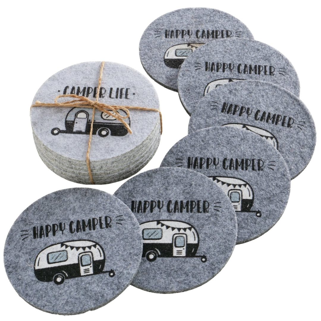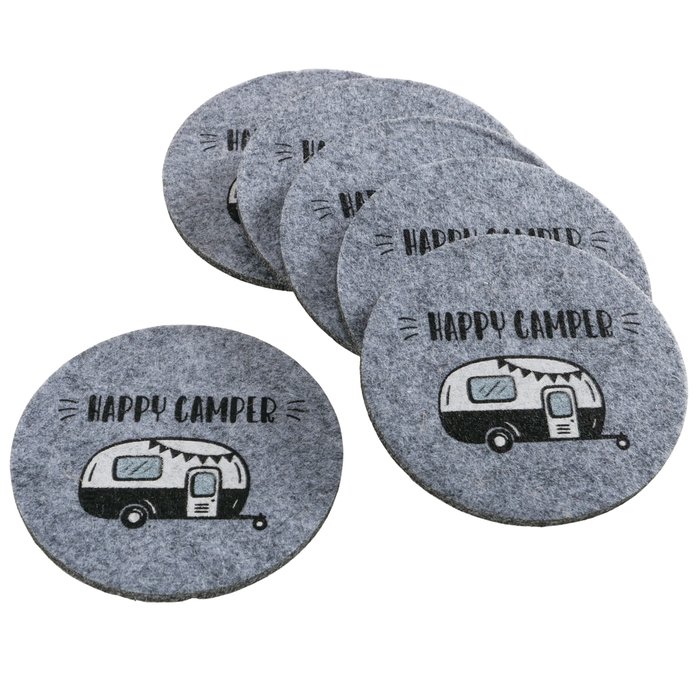Leuke onderzetters voor op je campingtafel!  Deze onderzetters komen in een set van 6 en zijn van vilt. Daardoor zijn ze handig voor je glazen. Door de grijze kleur passen ze al snel bij je interieur. Leuke toevoeging in je kampeermiddel, maar ook mooi voor thuis! We hebben 2 varianten.