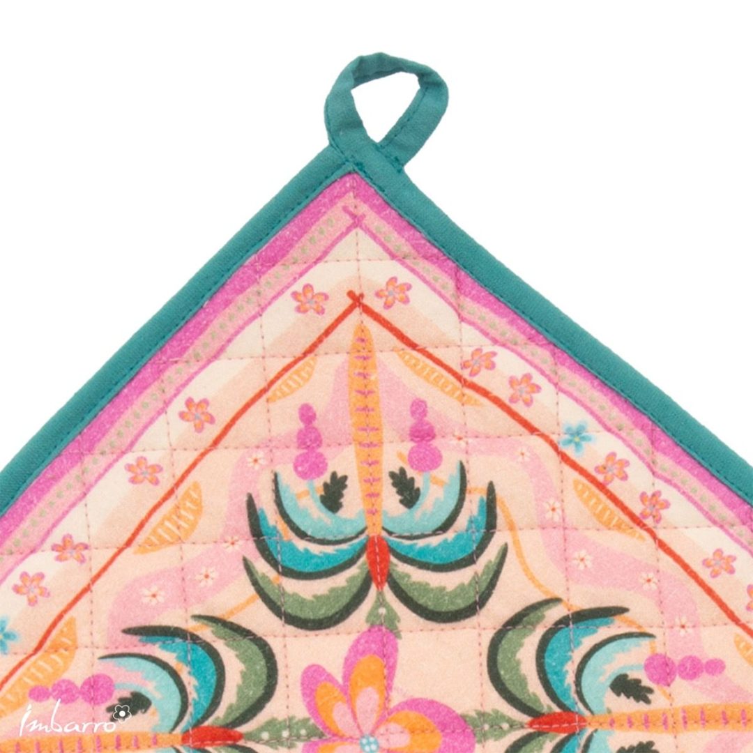 Deze pannenlappen van Imbarro in de Vista stijl brengen meteen een tropisch tintje in je keuken of bij de BBQ. De kleurrijke print met palmbomen zorgt voor een frisse, zomerse uitstraling en maakt van elk kookmoment iets gezelligs.