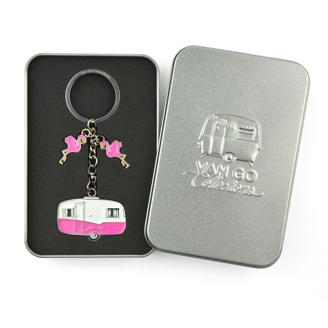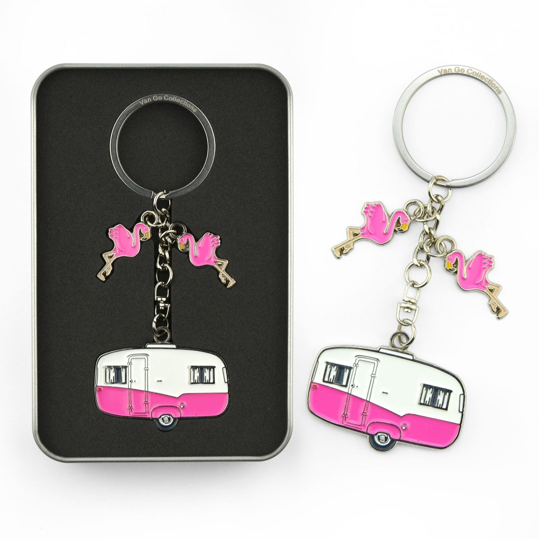 Deze sleutelhanger is het perfecte kado voor kampeerders die van vrolijk design en kwaliteit houden. De vrolijke retro caravan in roze uitvoering! Leuk detail zijn de kleine flamingo’s. Een stevige sleutelhanger van duurzaam metaal, ideaal voor aan de caravansleutels of gewoon aan de huissleutel om je elke dag even te herinneren aan het campingleven. Om lang plezier van te hebben!