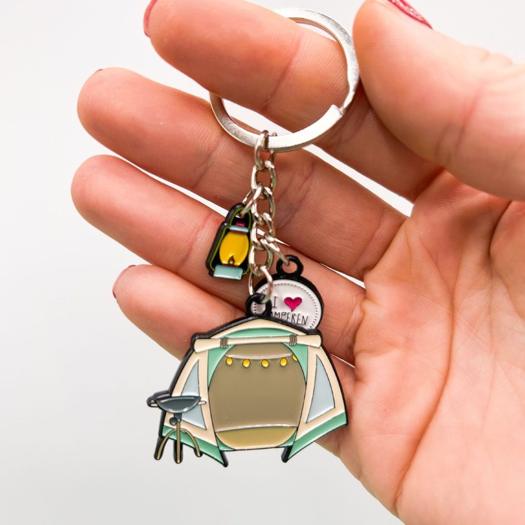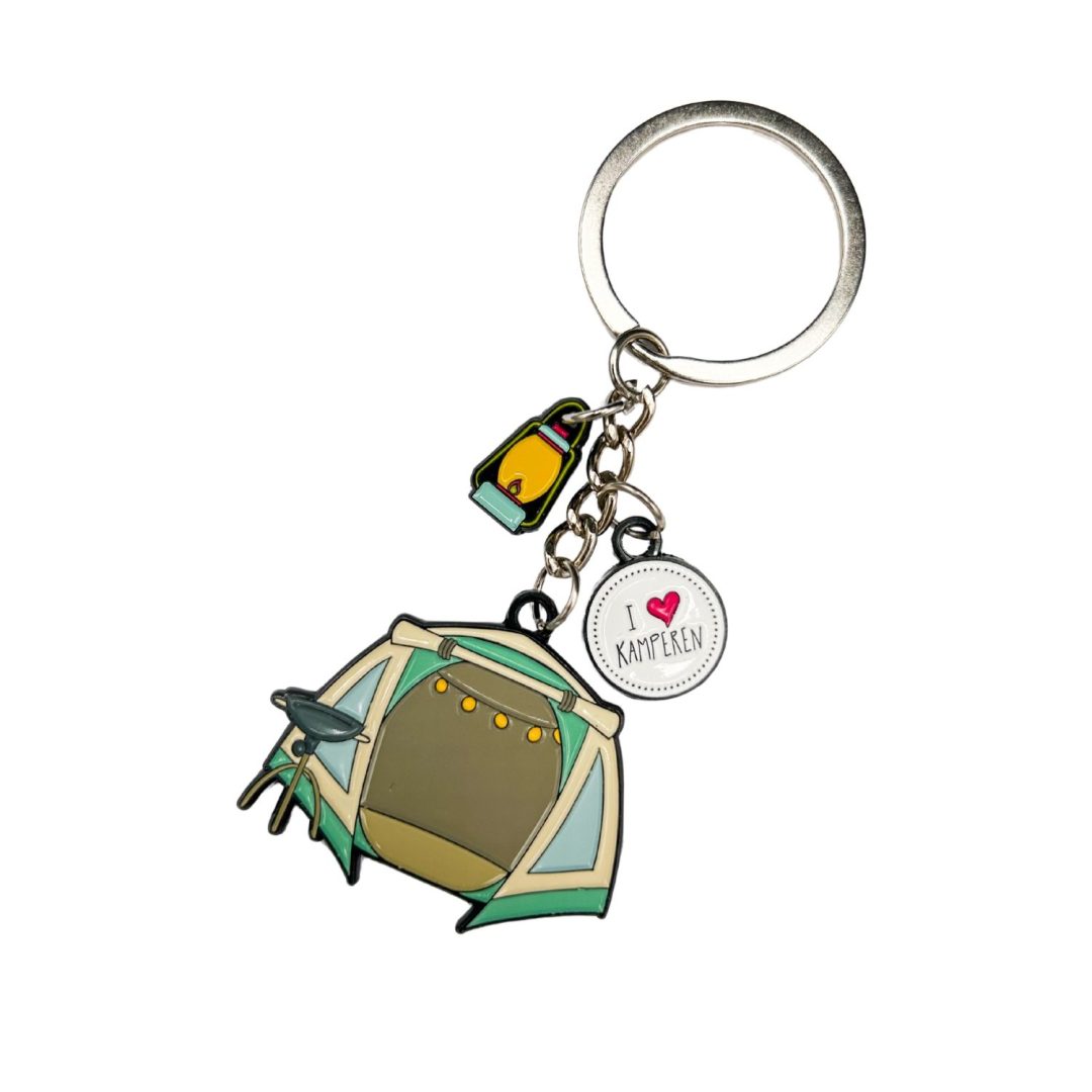 Die is leuk: een sleutelhanger tent in onze eigen I Love Kamperen stijl! Een stevige sleutelhanger van metaal van mooie kwaliteit, de tent is dubbelzijdig gekleurd. Aan de ring hangen ook twee leuke hangertjes: van een stormlampje en het I Love Kamperen logo. Doe hem aan je sleutelbos en zo heb je elke dag een heel leuk aandenken aan jouw mooiste vakanties! De totale lengte is circa 9 cm. De sleutelhanger komt op een kadokaartje in folie, ook heel leuk om kado te geven.