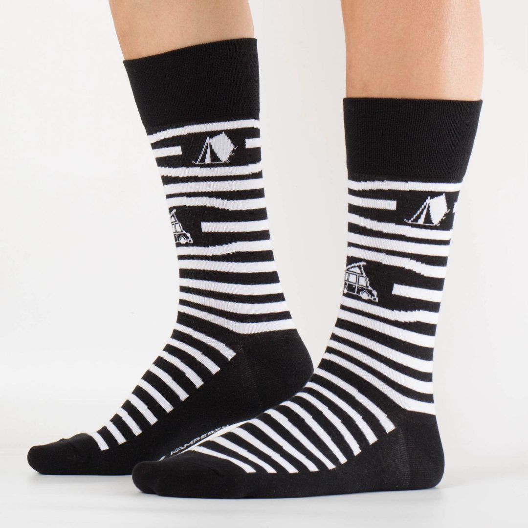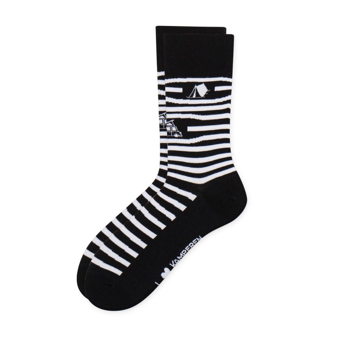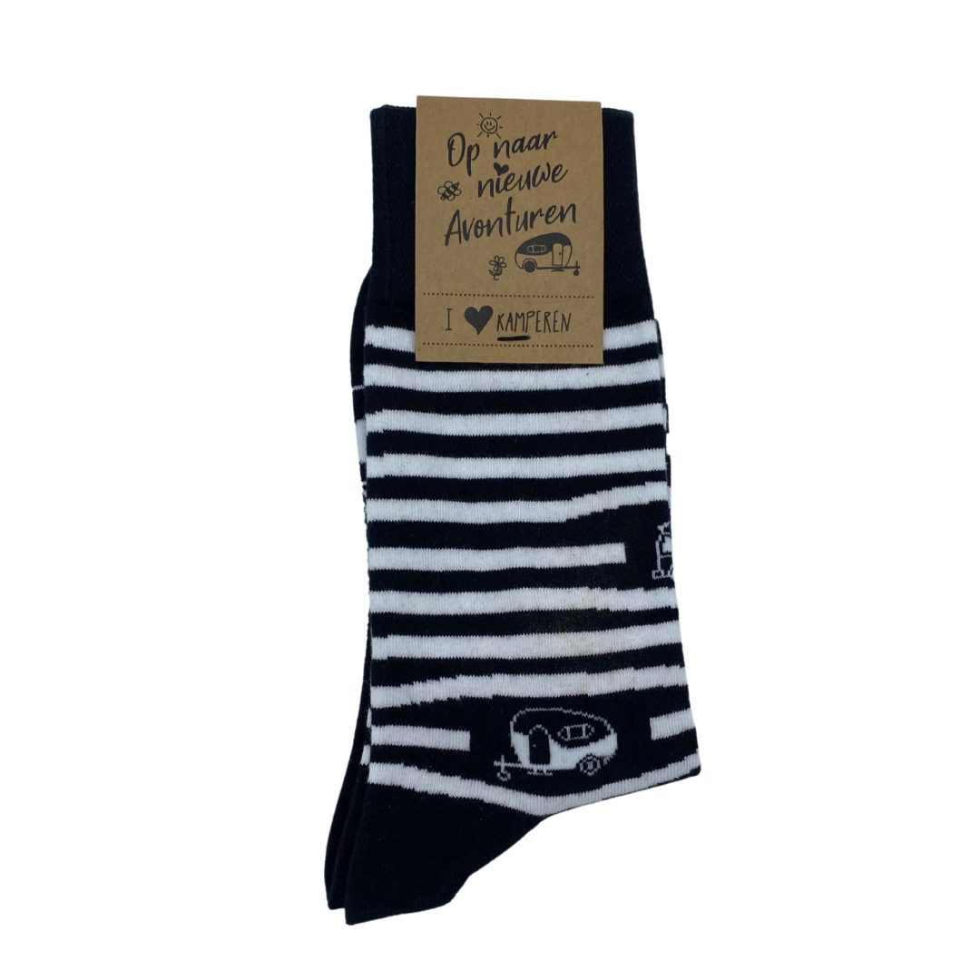 Show je sokken op de camping! Sokken voor échte blije kampeerders. Deze fijne sok met streepjes en caravan/tent/camper is superleuk als kadootje, of natuurlijk lekker voor jezelf!