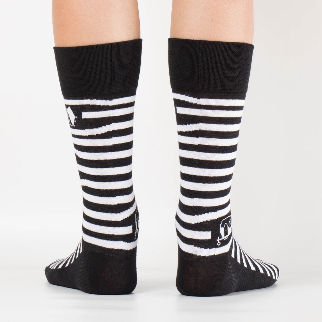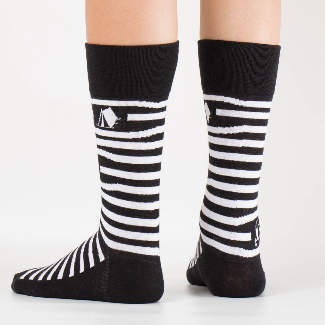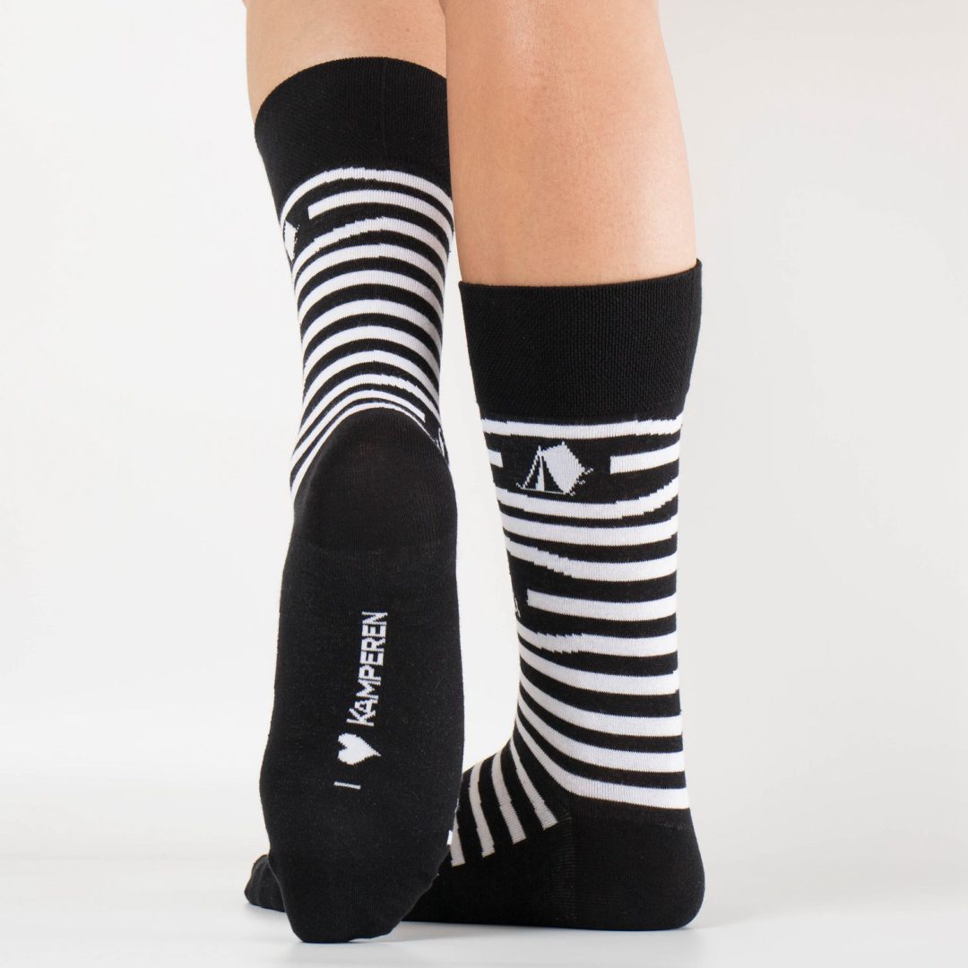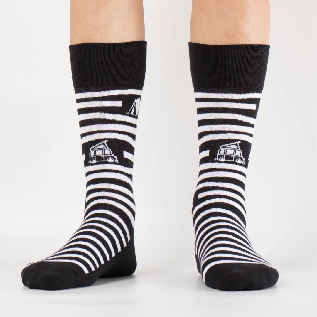 Show je sokken op de camping! Sokken voor échte blije kampeerders. Deze fijne sok met streepjes en caravan/tent/camper is superleuk als kadootje, of natuurlijk lekker voor jezelf!
