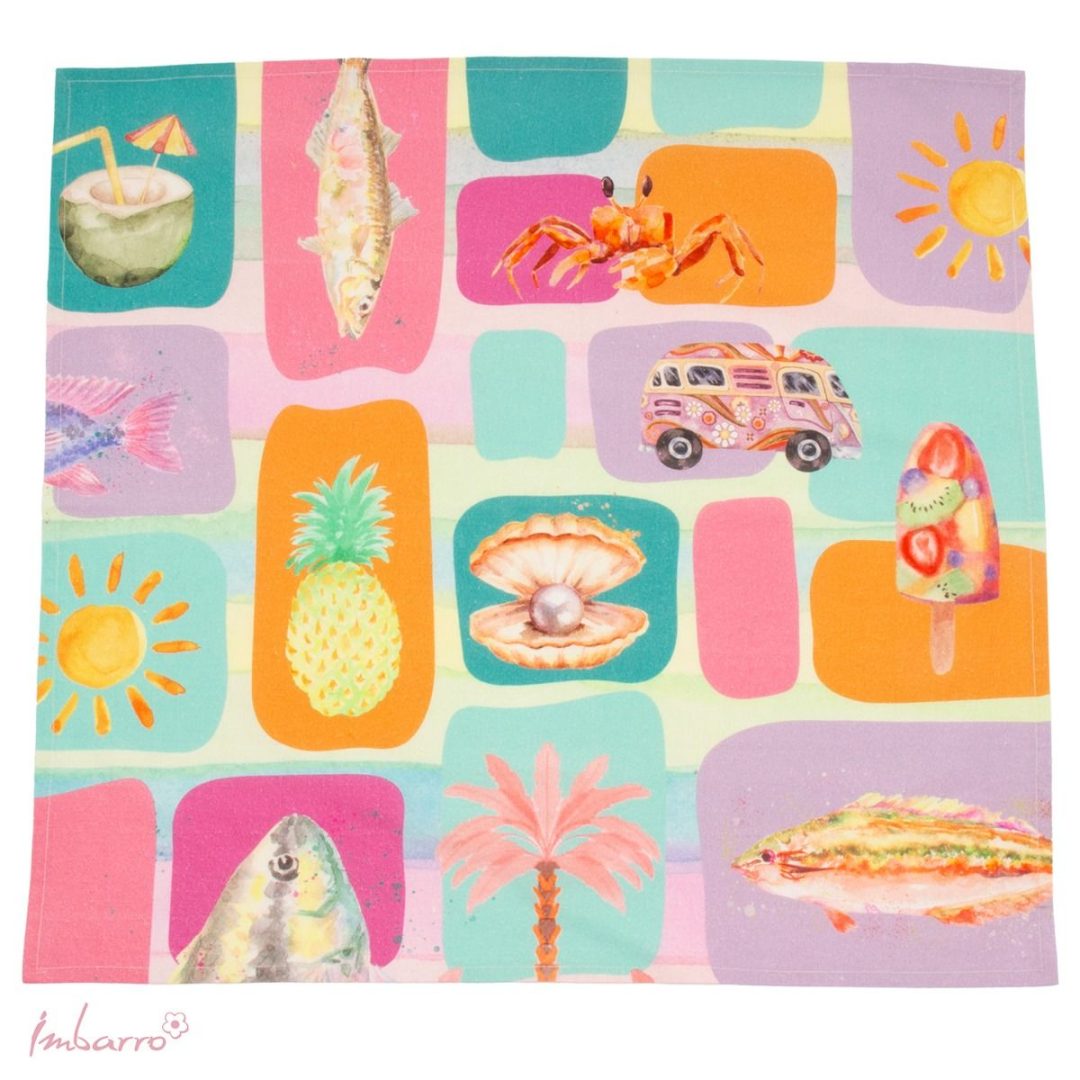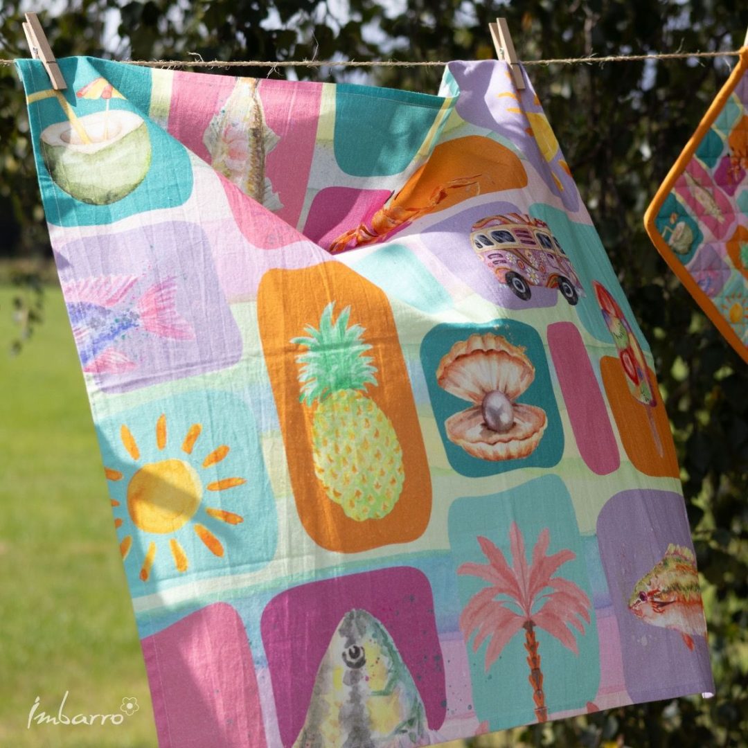 Met deze kleurrijke theedoek van Imbarro breng je meteen een zomerse sfeer in je keuken of op de camping. De levendige Summer Breeze print maakt zelfs het afdrogen nét wat leuker, of je nu in je caravan staat of thuis.