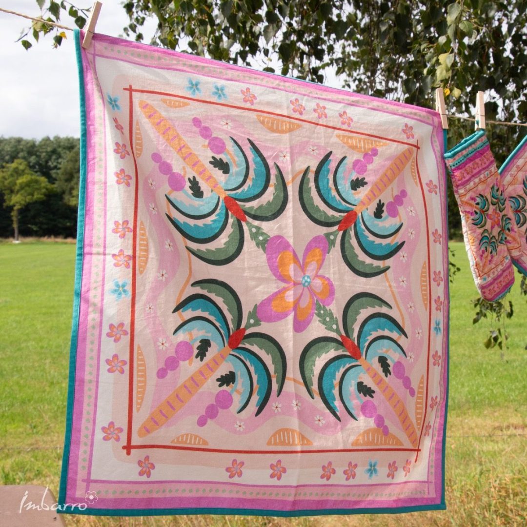 Met deze kleurrijke theedoek van Imbarro breng je meteen een zomerse sfeer in je keuken of op de camping. De levendige Vista print maakt zelfs het afdrogen nét wat leuker, of je nu in je caravan staat of thuis.