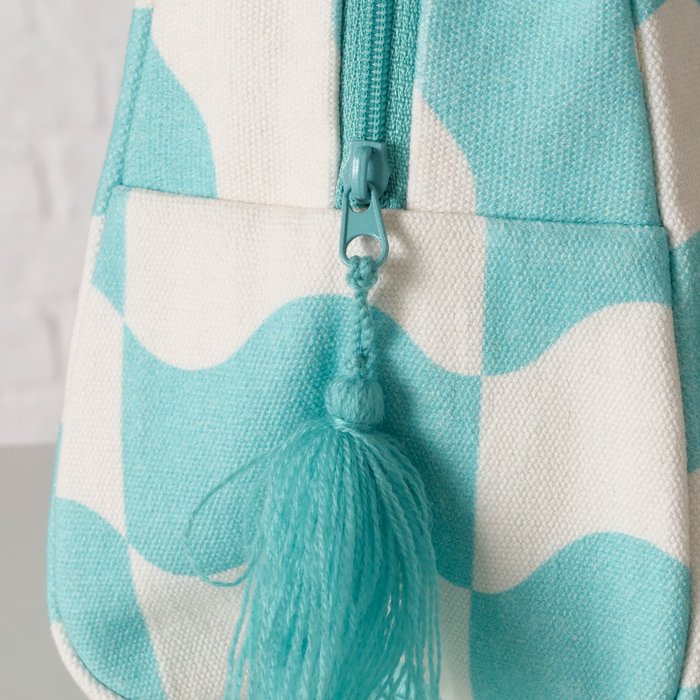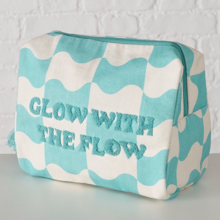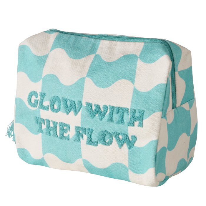 We houden van kleur op de camping!  Deze mintgestreepte toilettas van katoen uit deze nieuwe kleurrijke collectie is compact, maar ruim genoeg voor je dagelijkse essentials. De tekst “Go with the flow” geeft ’m die relaxte vakantievibe. Leuk voor onderweg, op de camping of gewoon in je weekendtas. Af te sluiten met een rits. Extra leuk: er is ook een bijpassende strandtas in dezelfde stijl, voor een matching set die gezien mag worden!
