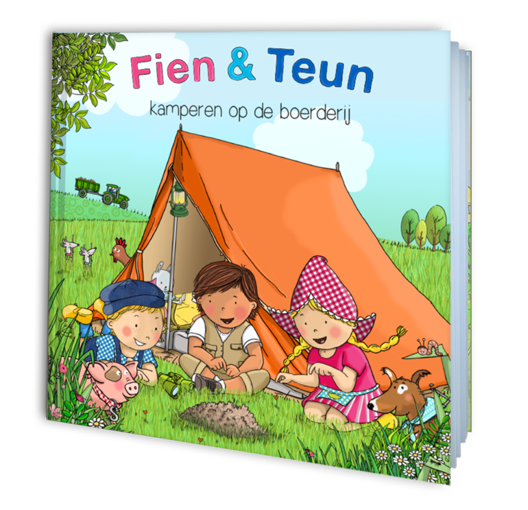 Een heerlijk voorleesboek in kampeerthema! Fien en Teun zijn twee boerenkinderen, bekend van Avonturenpark Molenwaard, het theater en Telekids. Samen beleven ze allerlei avonturen op de boerderij, waarbij ze kinderen meer leren over de herkomst van ons voedsel. In dit boekje komt hun neefje kamperen op de boerderij. Dit boekje is geschreven in samenwerking met SVR, de organisatie voor kleinschalig kamperen.