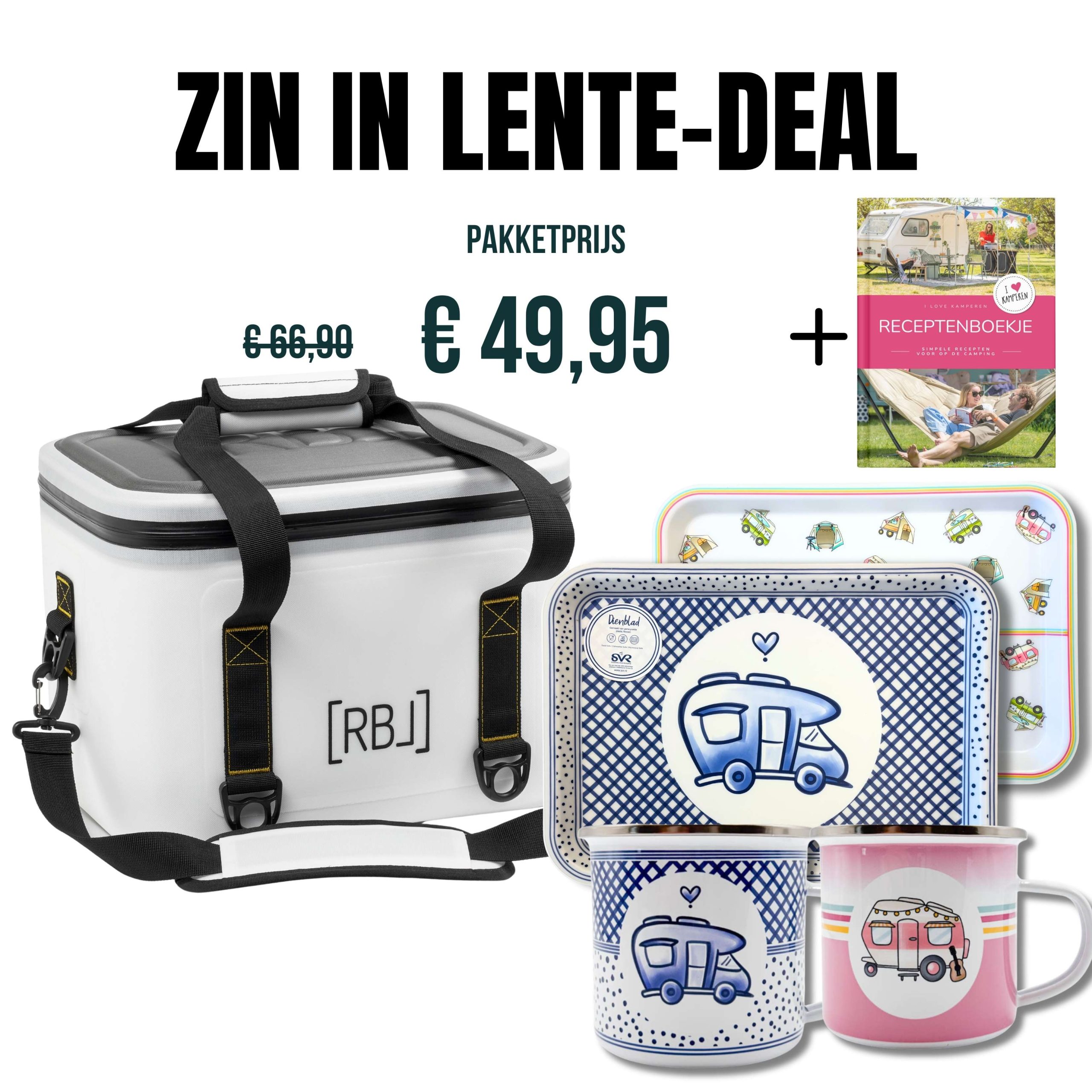 Je kiest daarnaast twee emaille mokken uit de SVR Collectie of I Love Kamperen collectie – ideaal voor koffie, thee of limonade onderweg. Het bijpassende dienblad maakt het plaatje compleet: handig voor broodjes, snacks of om je buitentafel in één keer te dekken.